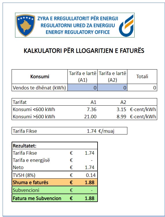 Zyra e Rregullatorit për Energji ka publikuar kalkulatorin për llogaritjen e faturës të energjisë elektrike, në të cilin qytetarët mund të plotësojnë të dhënat dhe të llogarisin sesa do të jetë vlera e faturës me tarifat e reja të propozuara nga ZRRE-ja.